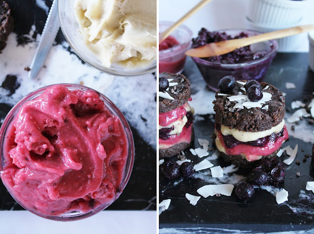 Assembly: spread the different sorbets onto your base brownie as you like, then top each one off with another brownie. Sprinkle with berries, coconut, cacao nibs and whatever else you like. Eat right away or keep in the freezer. Enjoy!