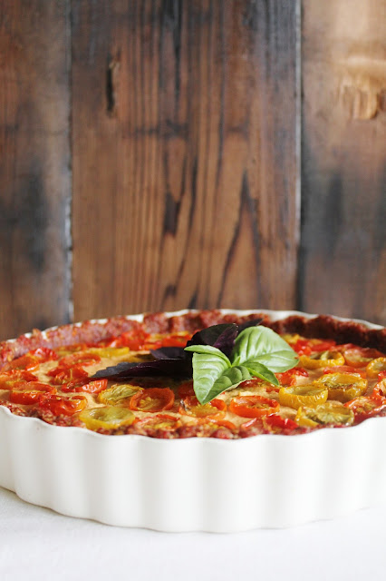 When everything is ready, spread your cheese onto your mushrooms and layer with herbs and tomatoes. You can double-shroom it (that is now a term) if you want, and/or use fresh mushrooms instead of marinated. Note: you're gonna have lots of left over cashew cheese. Let it sit in a quiet spot overnight then put in the fridge and eat within a week.